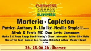 Nach zehn Jahren kehrt das legendäre Chiemsee Reggae Summer Festival vom 26. bis 28. Juni 2026 nach Übersee am Chiemsee zurück. Vor der traumhaften Kulisse der Chiemgauer Alpen werden am letzten Juniwochenende 2026 zahlreiche nationale und internationale Künstler:innen auf zwei Bühnen ihre Botschaften von Love, Peace & Unity verbreiten. Musikalisch liegt der Schwerpunkt wieder bei Reggae, Dancehall und Hip Hop und Insgesamt werden über 30 Künstler:innen beim Chiemsee Reggae Summer auftreten. Als Headliner konnten Marteria & Capleton gewonnen werden. Neu bestätigt sind: Anthony B, Lila Iké, Macka B & Roots Ragga Band, Afrob & Ferris MC, Silly Walks Discotheque, Treesha, Men of the Yeah, Unlimited Culture und Monkey Beach, die das bisherige Line Up mit Patrice, Neville Staple from The Specials, Jamaram, Marley’s Ghost, Jahcoustix, Don Letts, Solina und Damion Lee bereichern.