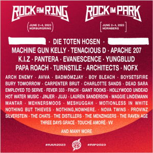 Die ersten Acts für Rock am Ring und Rock im Park 2023 sind bestätigt. Darunter auch die exklusiven Deutschland-Shows von Die Toten Hosen als erste der drei großen Headliner. Außerdem dabei: der internationale Superstar Machine Gun Kelly, Rock-Acts wie Tenacious D, Pantera, Papa Roach und Evanescence, Deutschrap-Stars wie Apache 207, Badmómzjay und K.I.Z sowie die neue Indie-Generation, vertreten durch Giant Rooks und Provinz. NOFX spielen zwei ihrer letzten Shows überhaupt auf den Bühnen von Ring und Park.