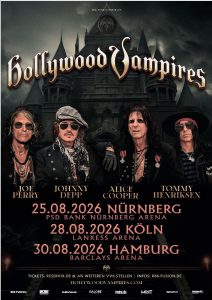 Mit den Hollywood Vampires geht im Sommer 2026 eine der prominentesten Rock-Supergroups erneut auf Tour. Im August wird die Band um Johnny Depp, Alice Cooper, Joe Perry (Aerosmith) und Tommy Henriksen (Crossbone Skully, Gitarrist Alice Cooper) drei exklusive Arena-Shows absolvieren, mit Auftritten in Nürnberg (25.08.2026, PSD Bank Nürnberg ARENA), Köln (28.08.2026, Lanxess Arena) und Hamburg (30.08.2026, Barclays Arena).
