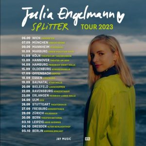 Julia Engelmann ist ein absolutes Multitalent. Ihren mittlerweile zehnjährigen, legendären Auftritt beim „Bielefelder Hörsaal-Slam“ haben bis heute rund 14 Millionen Menschen auf YouTube gesehen. Ihr Gedicht „Eines Tages, Baby“ bezeichnet sie als den „Urknall“ ihrer Karriere. Sie schrieb mehrere Lyrik-Bestseller, die allesamt auf der Spiegel-Bestseller-Liste landeten. Im Auftrag des Goetheinstituts reiste Julia nach San Francisco, gab u.a. an der Universität Oxford Workshops und hat als Kolumnistin geschrieben. Ebenso beeindruckend sicherte sich „Poesiealbum“, ihr 2017 erschienenes Musik-Debüt, neben einer ECHO-Nominierung aus dem Stand die #9 der deutschen Albumcharts. In diesem Jahr veröffentlichte Julia bereits diverse Singles, spielte auf Festivals und wird dazu ab dem 6.September mit ihrer „Splitter Tour 2023“ auf großer Live-Reise sein.