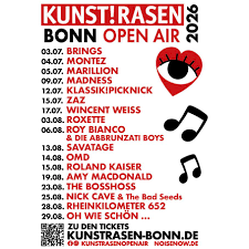 Die KUNST!RASEN Saison 2026 wird am Freitag, 3. Juli 2026 mit dem Konzert der Kölner Band BRINGS eröffnet. Bis einschließlich Sonntag, 30. August sind mehr als 20 Veranstaltungen auf dem idyllischen Gelände in Bonn-Gronau geplant. Das Konzert mit Roland Kaiser am 15. August 2026 ist bereits jetzt schon ausverkauft und das nach nicht langer Zeit im Vorverkauf.