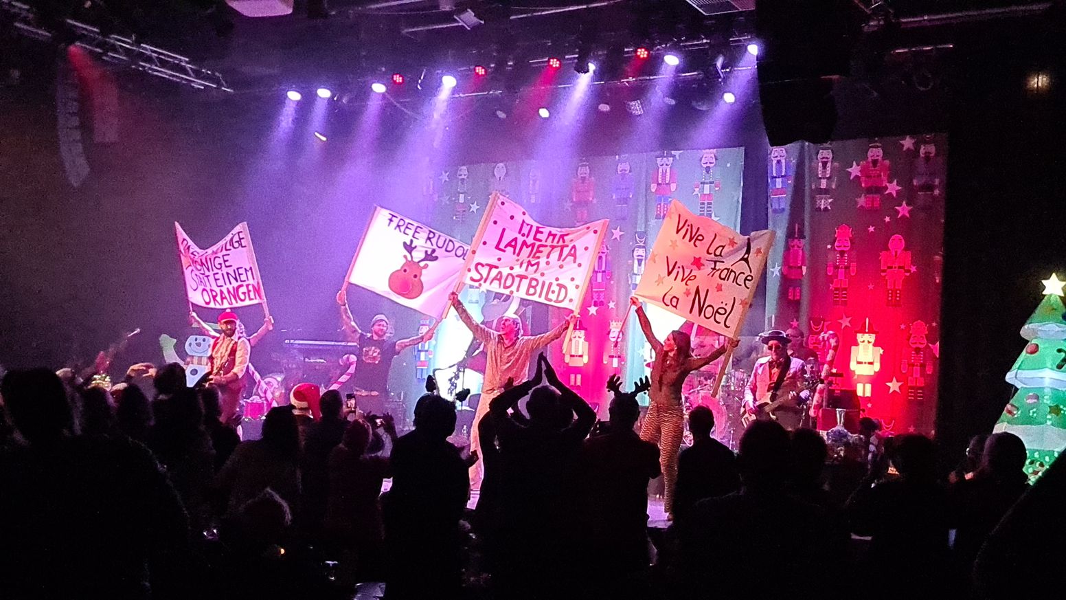 Schon beim Einlass machte sich die besondere weihnachtliche Atmosphäre bemerkbar. Ein Publikum, das von treuen Fans über neugierige Erstbesucher bis zu kompletten Familien und Freuden reichte, und eine Bühne, die mit funkelnden Aufblasfiguren, Lichterketten und bunten weihnachtlichen Bühnenhintergrund den passenden Rahmen bot. Horn betrat die Bühne gewohnt energiegeladen, gekleidet in einem Pelzmanteloutfit irgendwo zwischen Schlagerrevue und Glitzerkabarett, wie auch seine Kultband „Die Orthopädischen Strümpfe“, die sowohl musikalisch als auch optisch nahtlos in Horns schillerndes Bühnenuniversum hineinglitt. Zum Ensemble gehörten am Abend:
