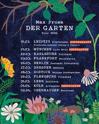 Das Konzert gliedert Prosa in zwei Hälften: In der ersten spielt er ausschließlich neue Stücke aus dem Album „Mein Garten“. Diese sind meist sanft und bedächtig, können aber auch mit flotteren und rhythmischeren Momenten aufwarten. Immer wieder unterbricht er das Programm für kurze Gedichte.