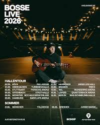 BOSSE, der aktuell an seinem zehnten Studioalbum schreibt, kündigt für 2026 eine große Hallentournee im Mai und zwei erste Sommerkonzerte an. Fans des Künstlers können sich also nicht nur auf neue Musik, sondern auch darauf freuen, diese bald live zu erleben. Die Hallentour führt BOSSE durch insgesamt elf Städte, von Köln bis Berlin. Mit München und Dresden werden auch bereits zwei von nur wenigen exklusiven Sommerkonzerten bekannt gegeben.